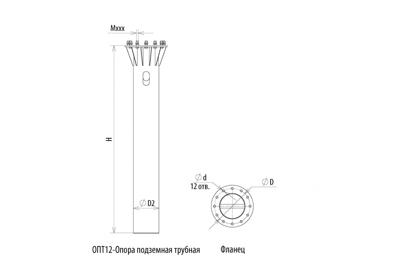 | Обозначение | Наименование | Высота H, м | Диаметр трубы D2, мм | Размер опорного фланца D, мм | Размер крепежного отверстия Ød, мм | Количество отверстий, шт | Крепежный комплект | Для каких опор |