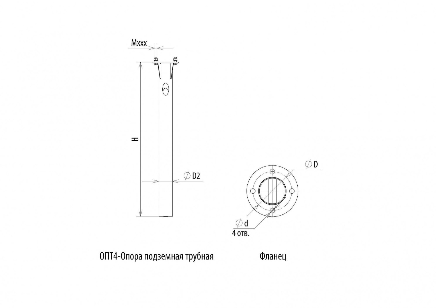 | Обозначение | Наименование | Высота H, м | Диаметр трубы D2, мм | Размер опорного фланца D, мм | Размер крепежного отверстия Ød, мм | Количество отверстий, шт | Крепежный комплект | Для каких опор |